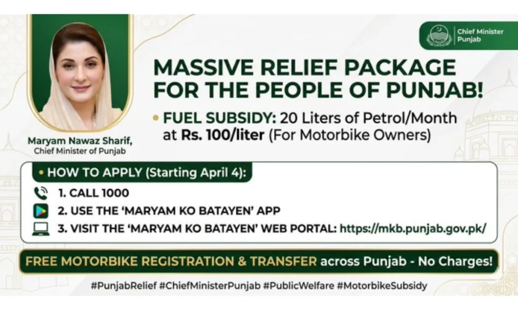 پنجاب حکومت نے عوام کو ریلیف دینے کے لیے پیٹرول پر رعایت حاصل کرنے کا باقاعدہ طریقہ کار جاری کر دیا ہے۔ وزیر اعلیٰ پنجاب مریم نواز نے سوشل میڈیا پر اپنے بیان میں بتایا کہ موٹر سائیکل سواروں کے لیے خصوصی سہولت فراہم کی جا رہی ہے جس کے تحت وہ رعایتی قیمت پر پیٹرول حاصل کر سکیں گے۔
